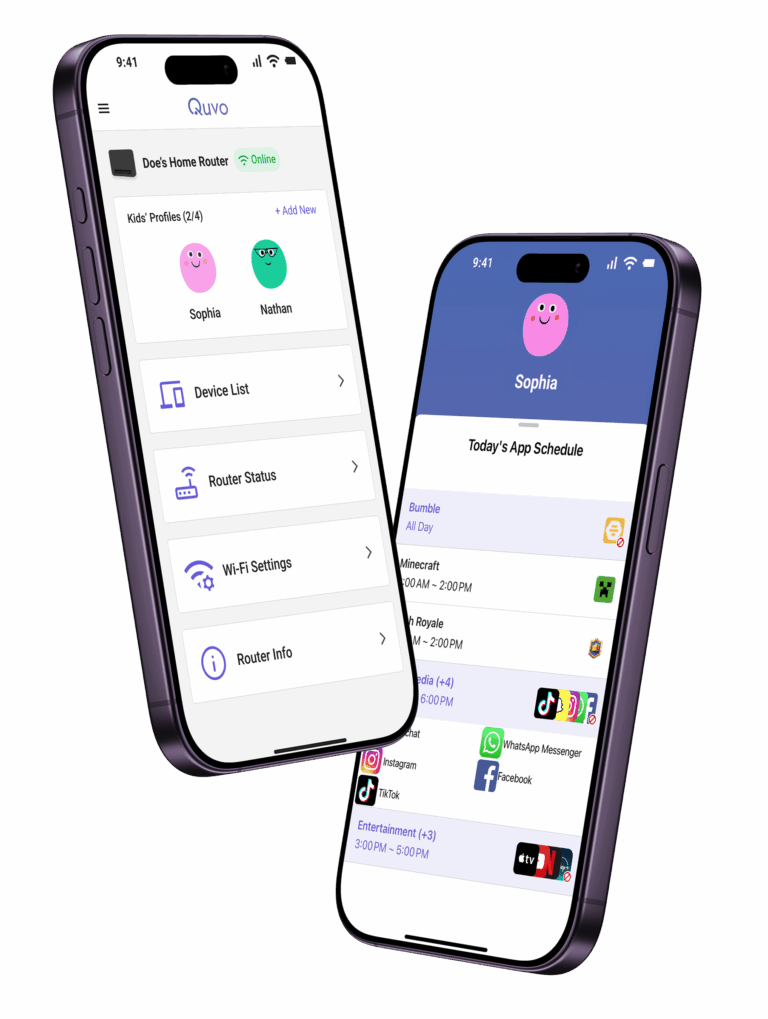Quvo App provides parental control features such as device management, content filters, internet schedules and more! The app also offers a Quvoi companion app so kids can participate in developing healthy habits!